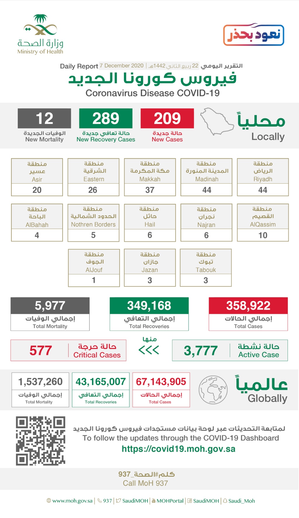 أعلنت وزارة الصحة اليوم ”الإثنين“ تسجيل 209 إصابة جديدة بفايروس كورونا المستجد المسبب لمرض ”كوفيد 19“. منها ”2“ في القطيف ليرتفع إجمالي الإصابات في المملكة إلى 358,922 حالة مؤكدة