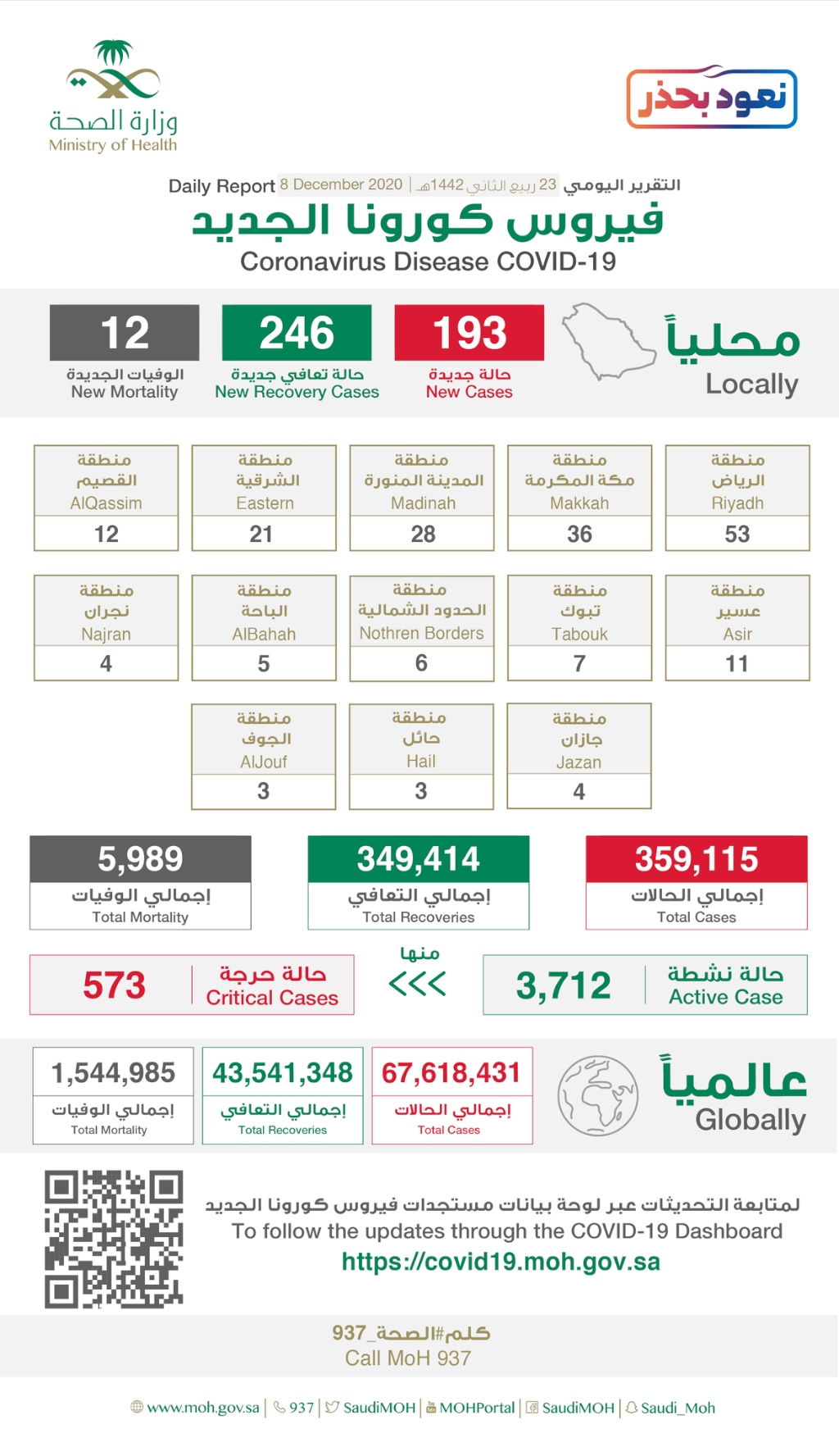 وتم تسجيل 246 حالة تعافٍ جديدة، لترتفع الحالات الإجمالية للتعافي إلى 349,414 حالة، ”97 % من إجمالي الإصابات المسجلة“.