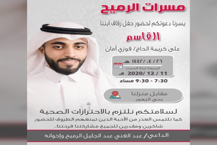 تحتفل عائلة الرميح وأمان في سيهات مساء يوم الجمعة بزفاف الشاب القاسم عبد الغني عبد الجليل الرميح على كريمة الحاج فوزي أمان مقابل منزلهم بحي الزهور وسط فرحة الأهل والأصدقاء ومحبي العريسين.