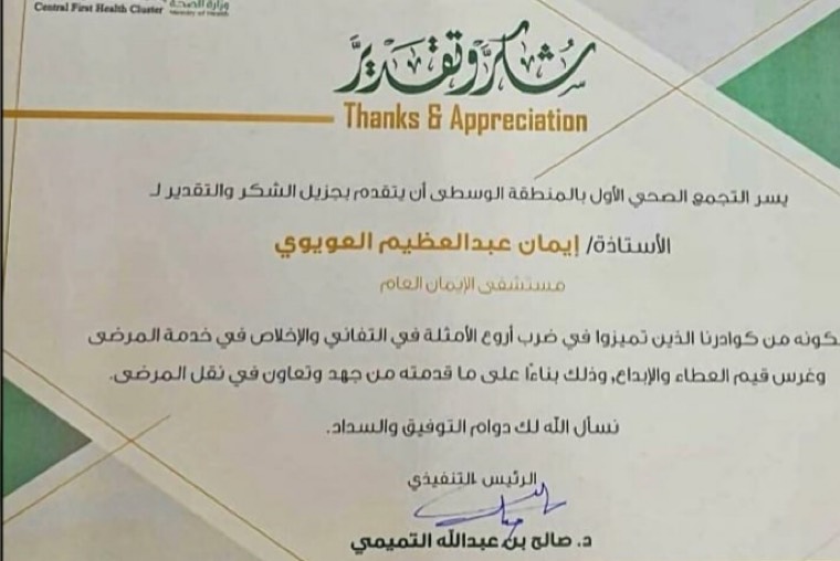 كرم التجمع الصحي الأول بالمنطقة الوسطى الاخصائية بمستشفى الإيمان العام ايمان عبد العظيم علي العويوي. بشهادة شكر وتقدير نظير ما قدمته من جهود مميزة لخدمةالمرضى وغرس قيم العطاء.