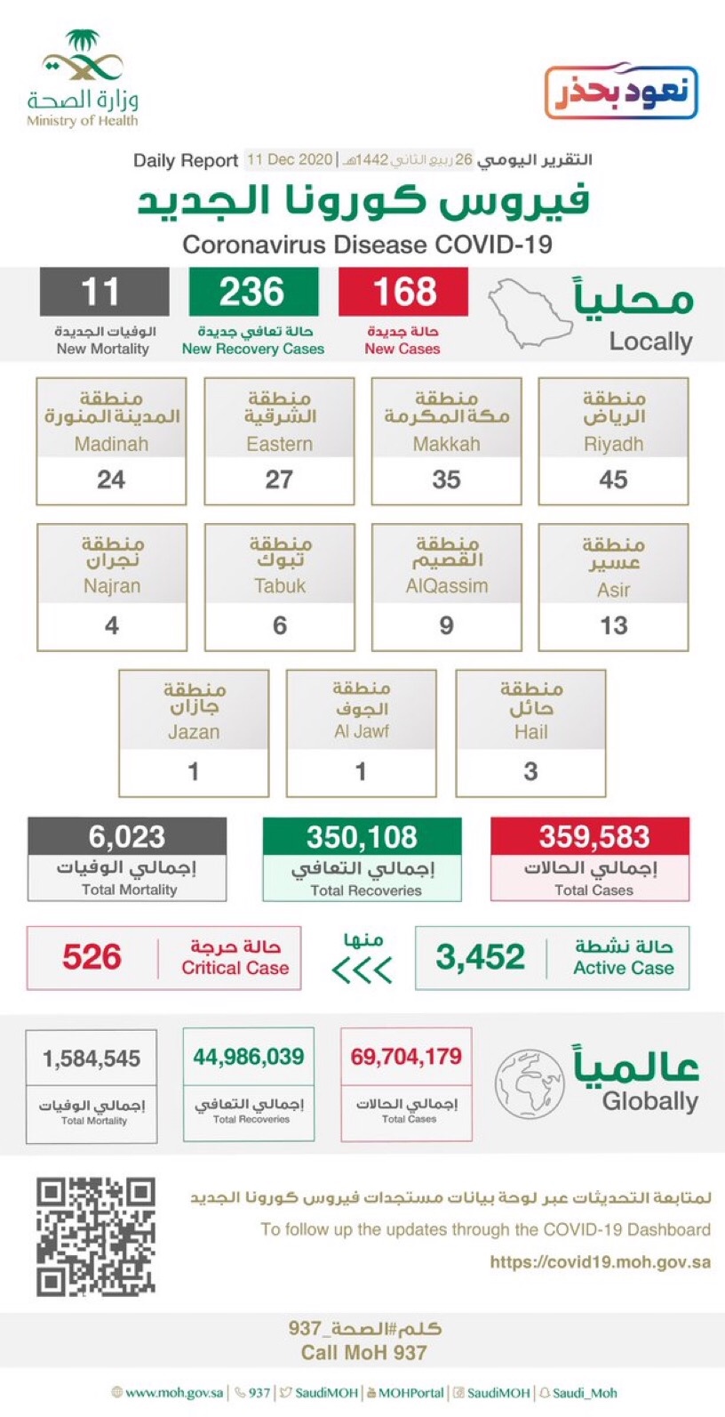 كما أعلنت الصحة عن تسجيل «236» حالة تماثلت للشفاء، ليصل مجموع المتعافين إلى «350,108» حالة تعافي، فيما ارتفع إجمالي الوفيات في المملكة إلى «6012» حالة بعد تسجيل «11» حالة وفاة جديدة.
