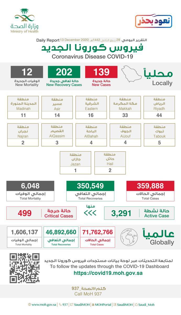 الصحة تسجل «139» إصابة جديدة بكورونا.. منها ”2“ في القطيف