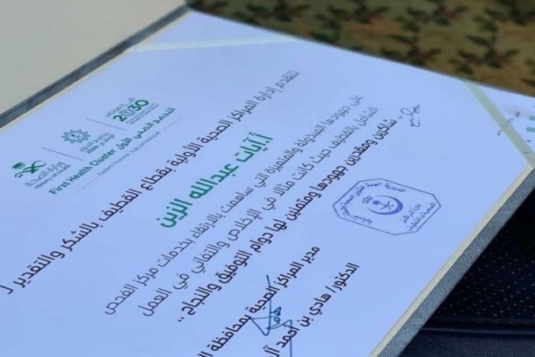 كرمت ادارة صحة القطيف التكاملية الأخصائية بمركز الفحص الشامل بالقطيف آيات عبدالله الزين. بشهادة شكر وتقدير نظير ما قدمته من جهود مميزة لخدمة الوطن والمجتمع من خلال مشاركتها في محاربة جائحة كوفيد -19.