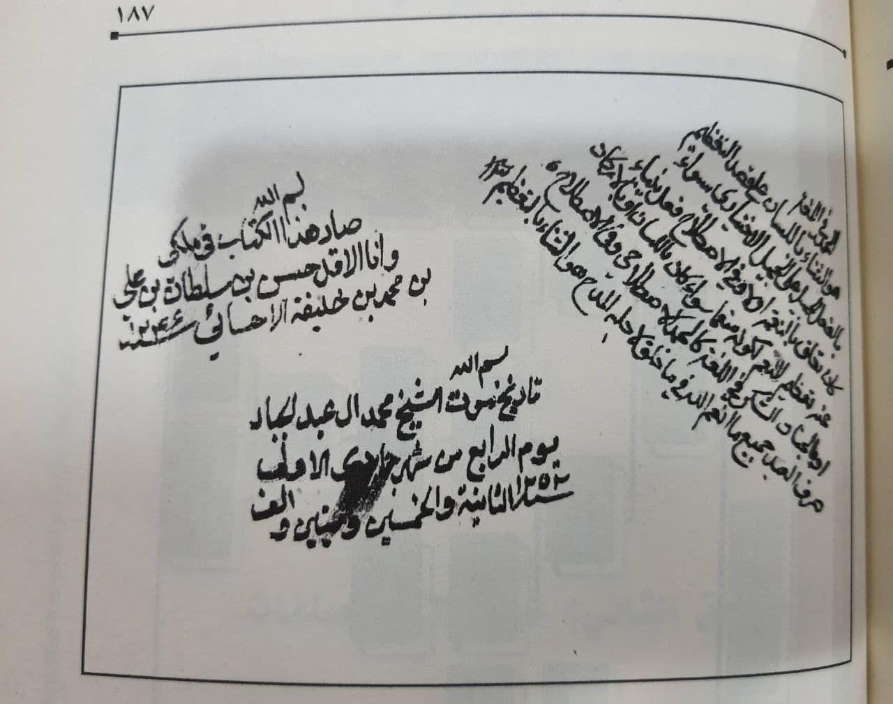 كما كتب على مجموع من نسخه وتملكاته بعد أن سجل قيد تملكه فقال: «بسم الله. صار هذا الكتاب في ملكي وأنا الأقل حسن بن سلطان بن علي بن محمد بن خليفة الأحسائي سنة 1246».