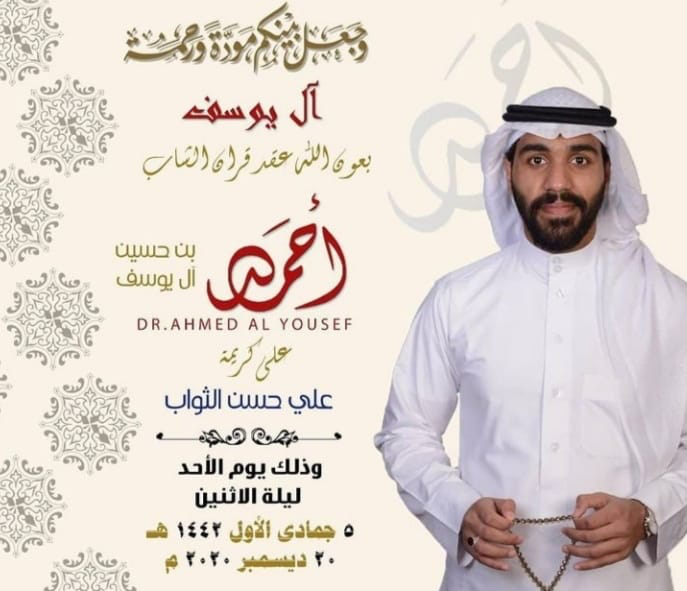 احتفلت عائلة آل يوسف والثواب في سيهات مساء يوم الأحد بعقد قران الشاب أحمد حسين آل يوسف على كريمة الحاج علي حسن الثواب وسط فرحة الأهل والأصدقاء ومحبي العريسين.