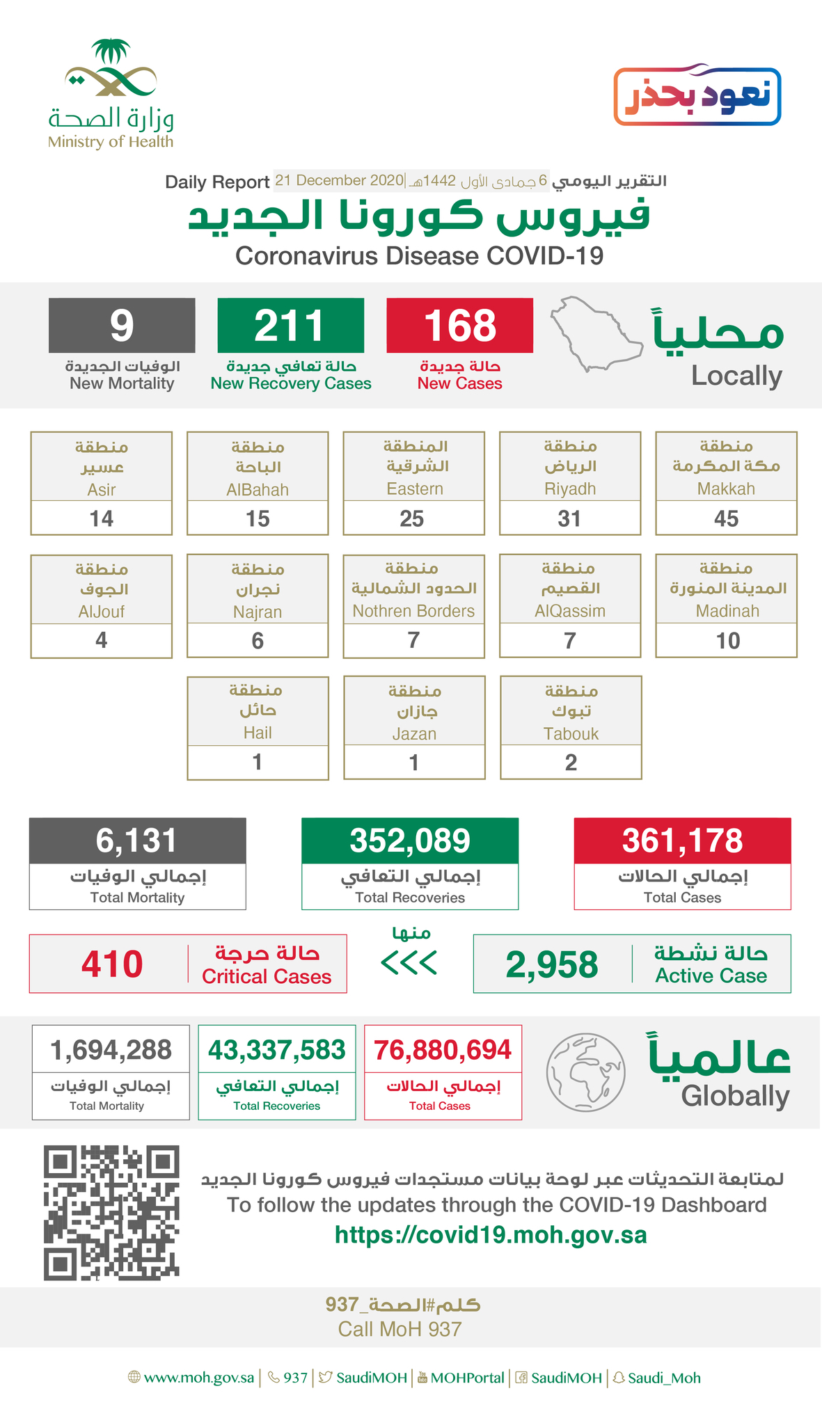 كما أعلنت الصحة عن تسجيل ”211“ حالة تماثلت للشفاء، ليصل مجموع المتعافين إلى ”352,089“ حالة تعافي، فيما ارتفع إجمالي الوفيات في المملكة إلى ”6,131“ حالة بعد تسجيل ”9“ حالة وفاة جديدة
