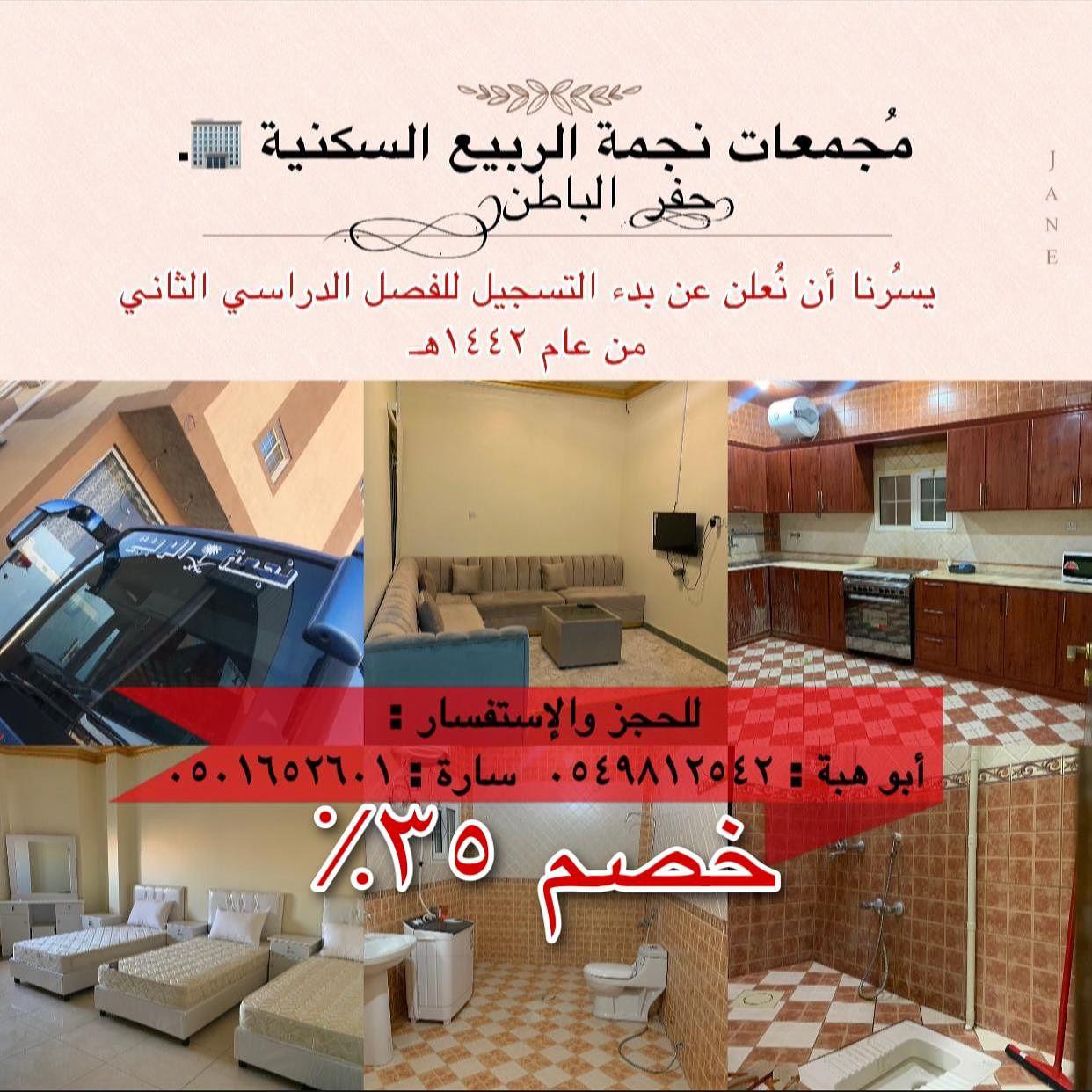 تعلن مجمعات نجمة الربيع السكنية بحفر الباطن عن بدء التسجيل للفصل الدراسي الثاني وخصم 35 %