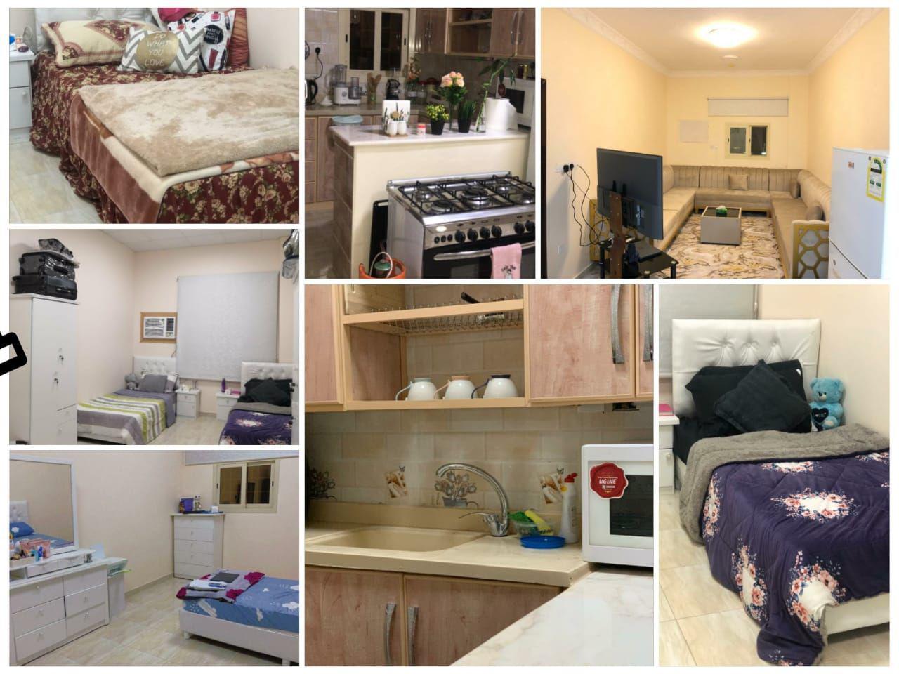 - كل شقة تتكون من دورتين مياه وصاله ومطبخ. كمايوجد ميكرويف مع فرن مع ثلاجة كبيرة للأيدامات وغساله خاصة بالشقه.