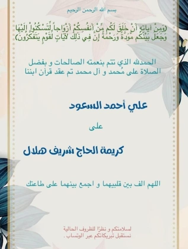 أسرة ”جهينة الإخبارية“ تهنئ العريسين وعائلتيهما وتسأل الله ان يبارك لهما، متمنين لهما حياة سعيدة.