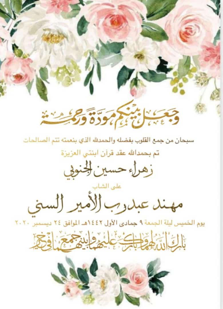احتفلت عائلة السني والجنوبي في تاروت مساء يوم الخميس بعقد قران الشاب مهند عبد الأمير السني على الشابة زهراء حسين الجنوبي وسط فرحة الأهل والأصدقاء ومحبي العريسين.