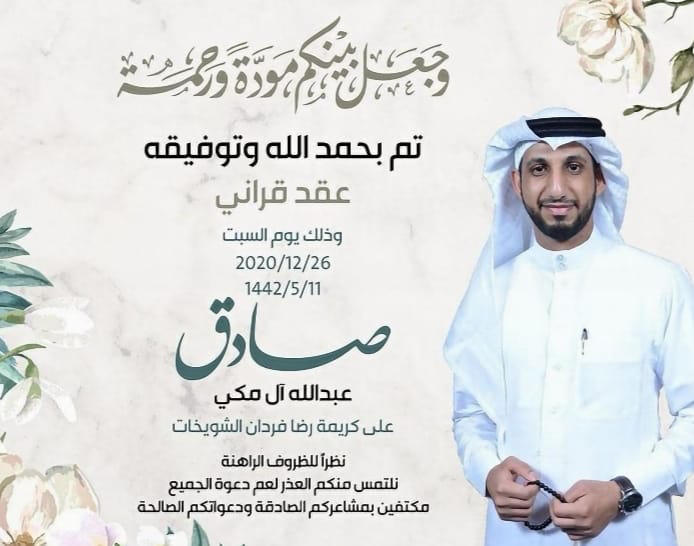 احتفلت عائلة آل مكي والشويخات في سيهات مساء يوم السبت بعقد قران الشاب صادق عبدالله آل مكي على كريمة الحاج رضا فردان الشويخات وسط فرحة الأهل والأصدقاء ومحبي العريسين.