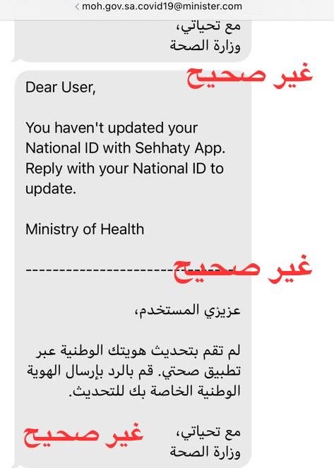 وقالت الصحة عبر تويتر: تحذر وزارة الصحة من التجاوب مع رسائل التصيد، وتوضح بأن هذه الرسائل لا يتم إرسالها من الوزارة أو أحد برامجها المعتمدة.