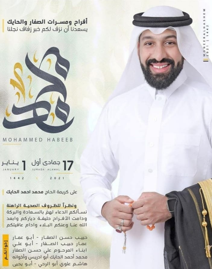تحتفل عائلة الصفار والحايك في القطيف مساء يوم الجمعة بزفاف الشاب محمد حبيب الصفار علي كريمة الحاج محمد أحمد الحايك وسط فرحة الأهل والأصدقاء ومحبي العريسين.