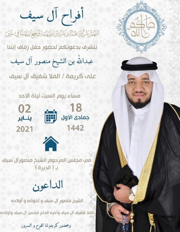 تحتفل عائلة آل سيف في تاروت مساء يوم السبت بزفاف الشاب عبدالله بن الشيخ منصور آل سيف على كريمة الحاج المُلا شفيق آل سيف في مجلس المرحوم الشيخ منصور آل سيف بحي الديرة بتاروت وسط فرحة الأهل والأصدقاء ومحبي العريسين.