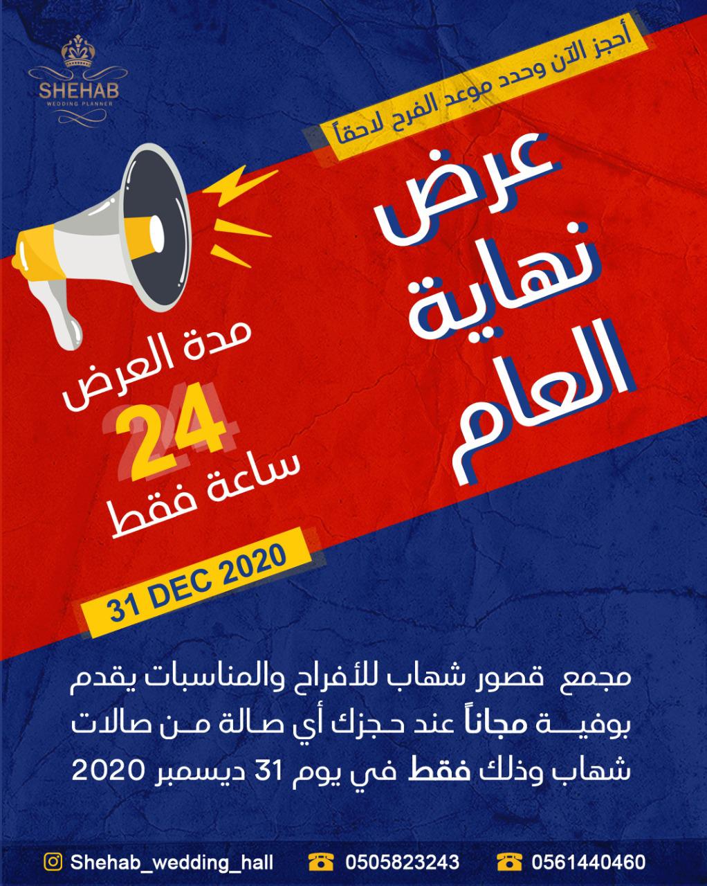 احجز أي قاعة من قاعات شهاب قبل نهاية 2020 واحصل على البوفيه مجانا.