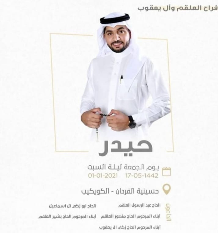 تحتفل عائلة العلقم وآل يعقوب في القطيف مساء يوم الجمعة بزفاف الشاب حيدر عبد الرسول العلقم على كريمة الحاج المرحوم زكي آل يعقوب في حسينية الفردان بالكويكب وسط فرحة الأهل والأصدقاء ومحبي العريسين.
