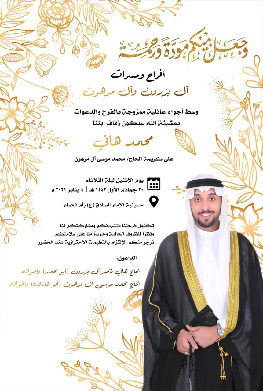 تحتفل عائلة آل بزرون والمرهون في أم الحمام مساء يوم الإثنين بزفاف الشاب محمد هاني ناصر آل بزرون على كريمة الحاج محمد موسى المرهون في حسينية الإمام الصادق وسط فرحة الأهل والأصدقاء ومحبي العريسين.