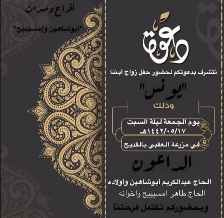 احتفلت عائلة أبو شاهين وامسيبيح في القديح مساء يوم الجمعة بزفاف الشاب يونس عبد الكريم أبو شاهين على كريمة الحاج طاهر امسيبيح في مزرعة العقبى بالقديح وسط فرحة الأهل والأصدقاء ومحبي العريسين.