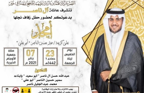 تحتفل عائلة آل ناصر في الأوجام مساء يوم الخميس بزفاف الشاب أمجد عبدالله حسن آل ناصر على كريمة الحاج سمير حسين الناصر في صالة جمعية الأوجام الخيرية وسط فرحة الأهل والأصدقاء ومحبي العريسين.