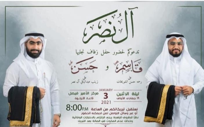 تحتفل عائلة آل نصر في سيهات مساء يوم الأحد بزفاف الشاب قاسم حجي آل نصر على الشابة رحمة حسن الشويخات، والشاب حسن علي آل نصر على الشابة زينب عبد الباقي آل نصر، في مركز الأمير فيصل قاعة اللؤلؤة وسط فرحة الأهل والأصدقاء ومحبي العرسان.