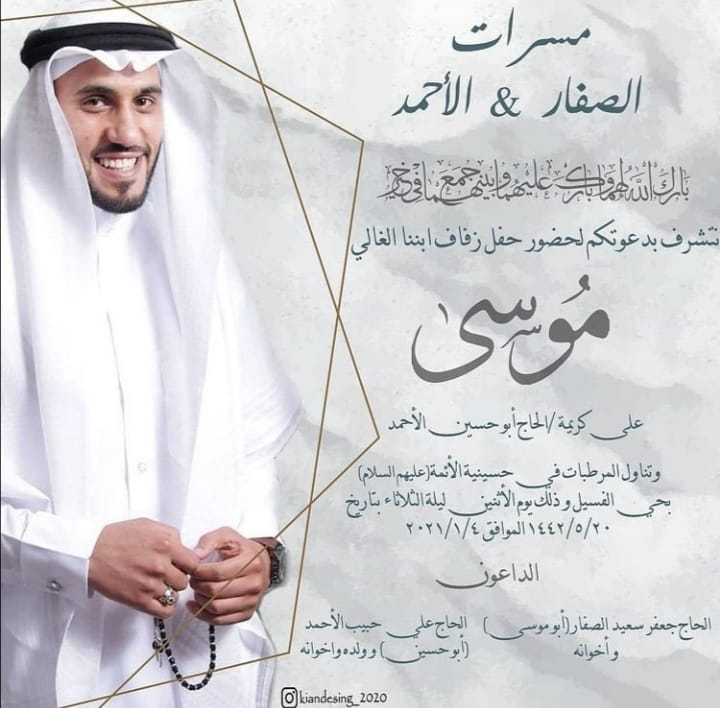 تحتفل عائلة الصفار والأحمد في تاروت مساء يوم الإثنين بزفاف الشاب موسى جعفر سعيد الصفار على كريمة الحاج علي حبيب الأحمد «أبو حسين» في حسينية الأئمة بالفسيل وسط فرحة الأهل والأصدقاء ومحبي العريسين.