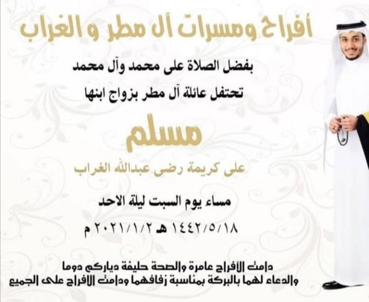 احتفلت عائلة آل مطر والغراب في العوامية مساء يوم السبت بزفاف الشاب مسلم آل مطر على كريمة الحاج رضي عبدالله الغراب وسط فرحة الأهل والأصدقاء ومحبي العريسين.