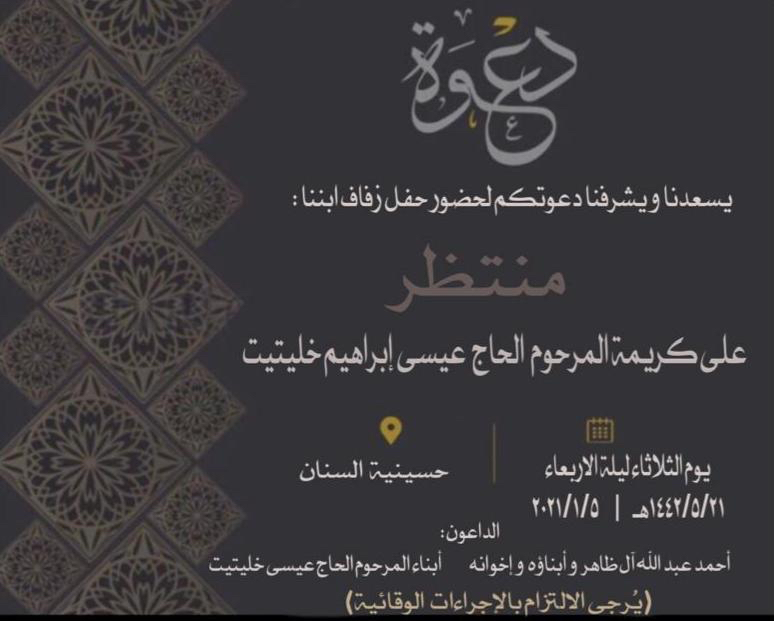 تحتفل عائلة آل ظاهر وخليتيت في القطيف مساء يوم الثلاثاء بزفاف الشاب منتظر أحمد عبدالله آل ظاهر على كريمة الحاج المرحوم عيسى ابراهيم خليتيت في حسينية السنان وسط فرحة الأهل والأصدقاء ومحبي العريسين.