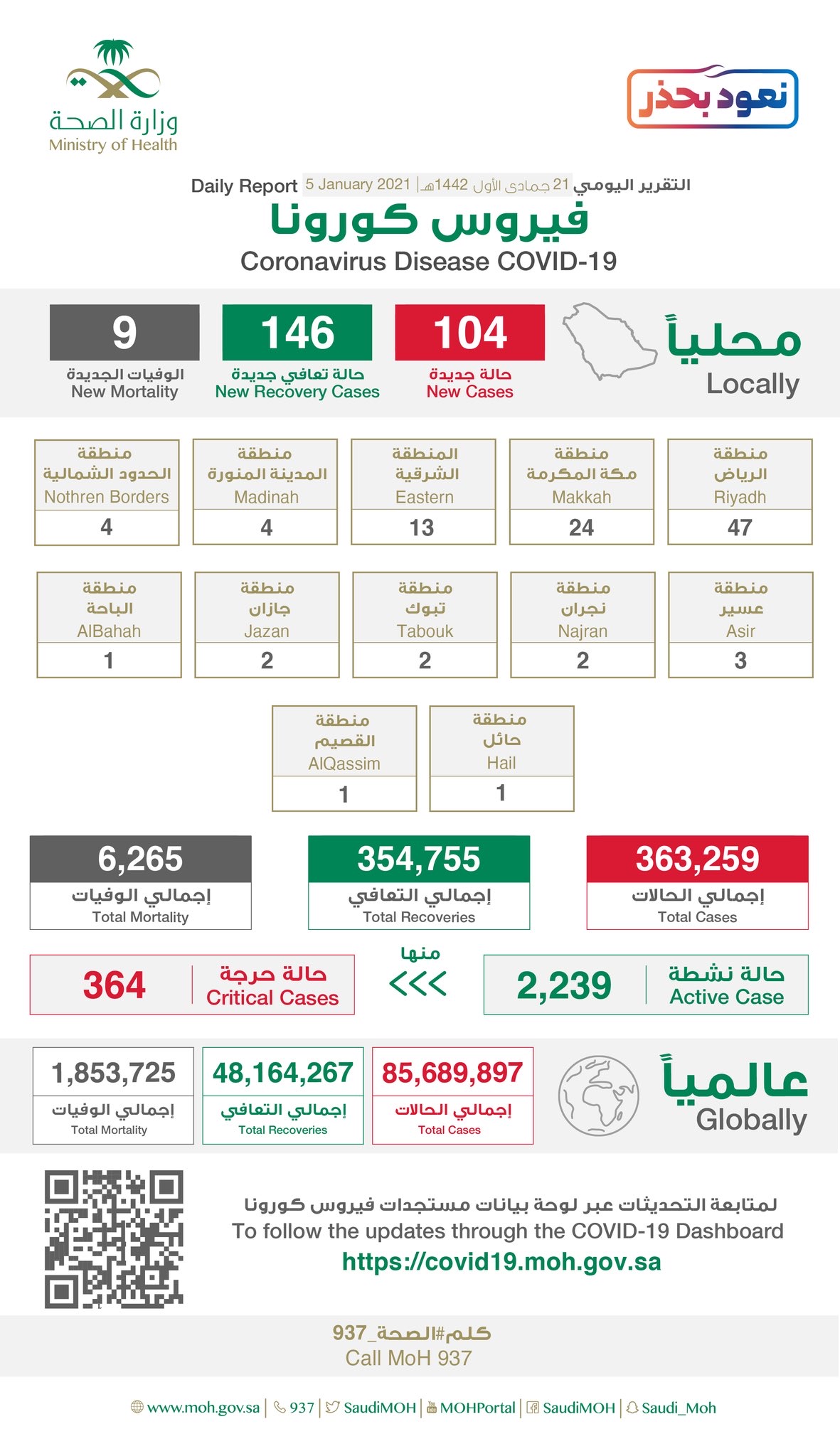 أعلنت وزارة الصحة، اليوم الثلاثاء عن تسجيل ”104“ حالة إصابة جديدة بفيروس كورونا المستجد خلال ال 24 ساعة الماضية منها ”2“ في القطيف، ليرتفع إجمالي عدد الإصابات المسجلة في المملكة إلى 363259 حالة.