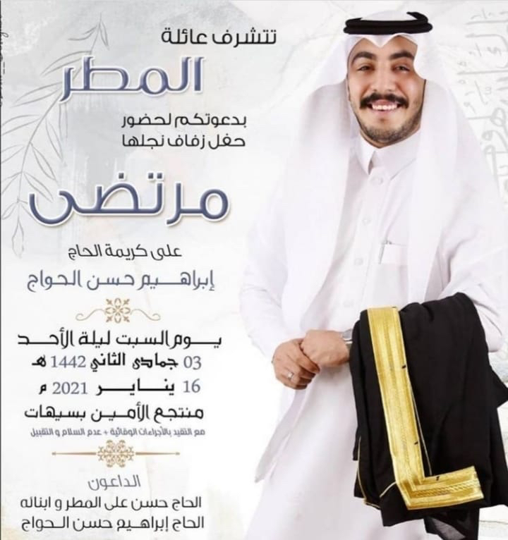 تحتفل عائلة المطر والحواج في سيهات مساء يوم السبت بزفاف الشاب مرتضى حسن علي المطر على كريمة الحاج ابراهيم حسن الحواج في منتجع الأمين بسيهات وسط فرحة الأهل والأصدقاء ومحبي العريسين.