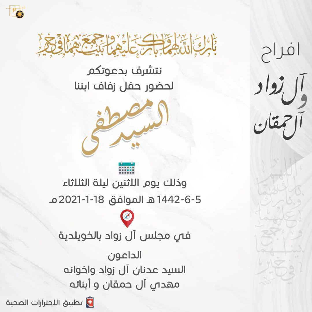 تحتفل عائلة آل زواد والحمقان في الخويلدية مساء يوم الإثنين بزفاف الشاب السيد مصطفى السيد عدنان آل زواد على كريمة الحاج مهدي الحمقان في مجلس آل زواد بالخويلدية وسط فرحة الأهل والأصدقاء ومحبي العريسين.