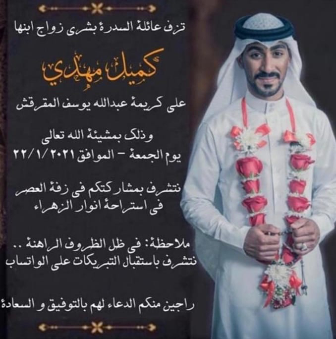 تحتفل عائلة السدرة والمقرقش في سيهات مساء يوم الجمعة بزفاف الشاب كميل مهدي السدرة على كريمة الحاج عبدالله يوسف المقرقش في استراحة انوار الزهراء وسط فرحة الأهل والأصدقاء ومحبي العريسين.