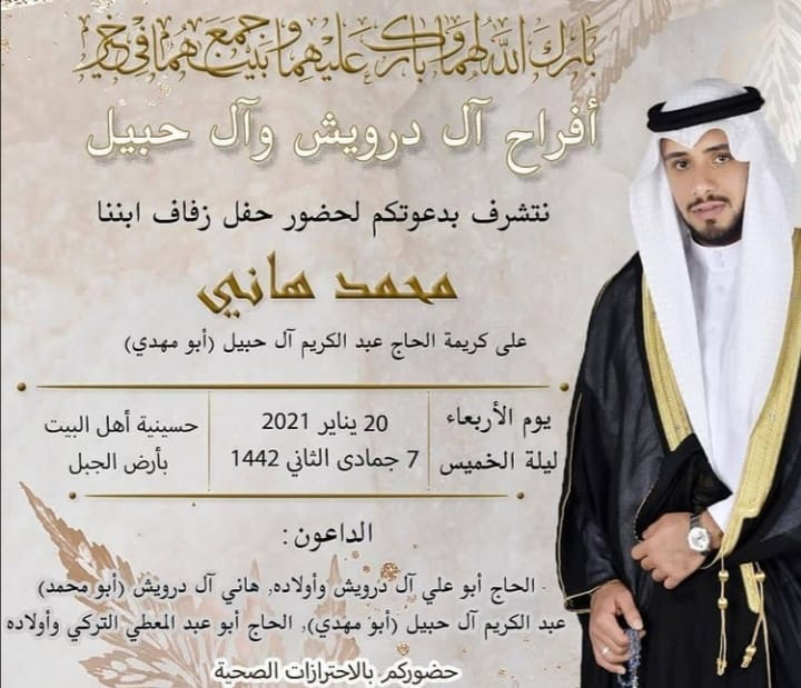 تحتفل عائلة آل درويش وآل حبيل في تاروت مساء يوم الأربعاء بزفاف الشاب محمد هاني آل درويش على كريمة الحاج عبد الكريم آل حبيل «أبو مهدي» في حسينية أهل البيت بأرض الجبل وسط فرحة الأهل والأصدقاء ومحبي العريسين.