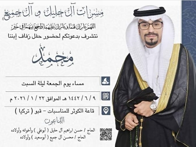 تحتفل عائلة آل حليل وآل جميع في تاروت مساء يوم الجمعة بزفاف الشاب محمد حسن ابراهيم آل خليل على كريمة الحاج محسن آل جميع «أبو سعيد» في قاعة الكوثر للمناسبات - بحي التركيا - وسط فرحة الأهل والأصدقاء ومحبي العريسين.