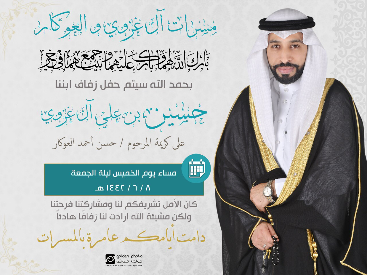 تحتفل عائلة آل غزوي و العوكار في العوامية مساء يوم الخميس بزفاف الشاب حسين علي آل غزوي على كريمة الحاج حسن أحمد العوكار وسط فرحة الأهل والأصدقاء ومحبي العريسين.