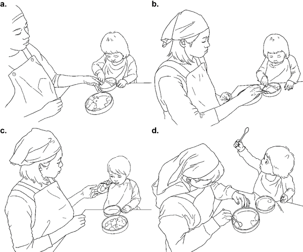 خلال أوقات الوجبات، هذه النتائج أظهرت أن لنظرات الأطفال الدارجين الى يدي مقدمي الرعية ولنظراتهم إلى وجوههم أدوار مختلفة في التواصل. إن انبثاق قدرة الطفل الدارج على استخدام الملعقة بشكل مناسب ليأكل بمفرده هي نتيجة للتفاعلات التبادلية التالية المنطوية على سلوك مقدم الرعاية وانتباه الطفل: