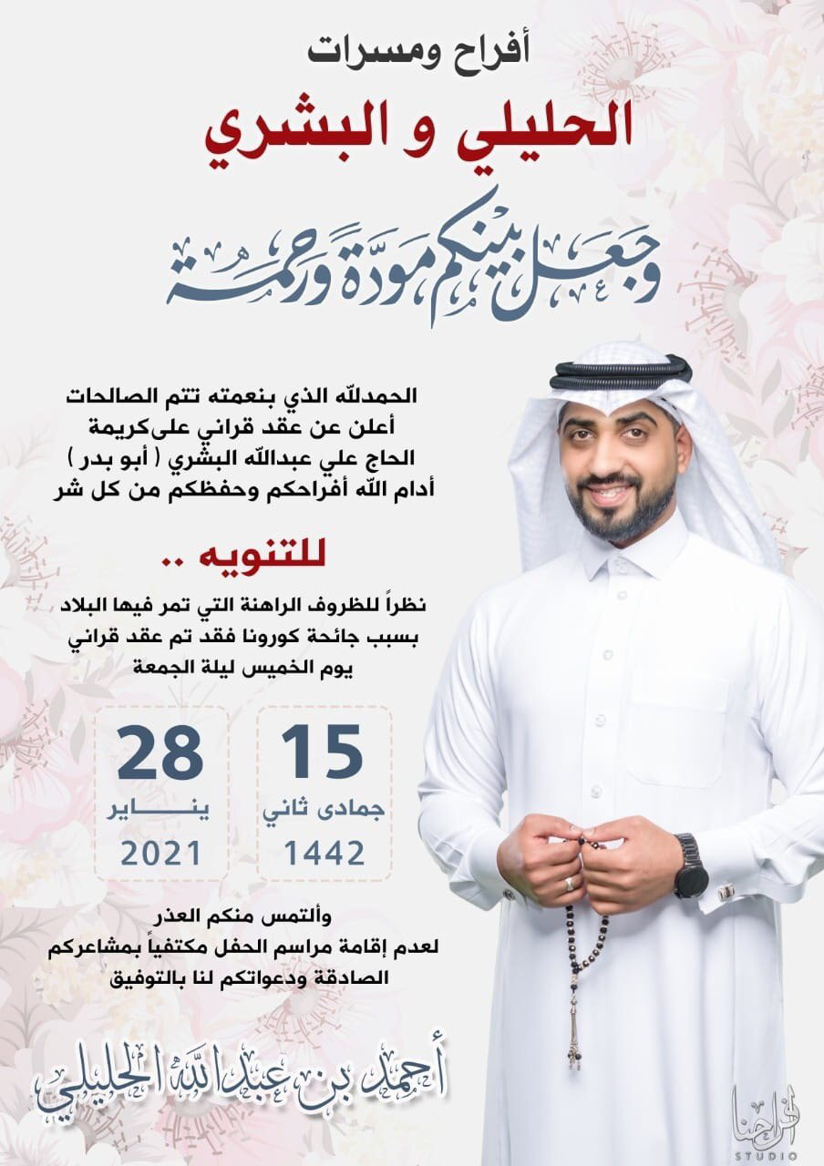 احتفلت عائلة الحليلي والبشري في صفوى مساء يوم الخميس بعقد قران الشاب أحمد عبدالله الحليلي على كريمة الحاج علي عبدالله البشري «أبو بدر» وسط فرحة الأهل والأصدقاء ومحبي العريسين، الذين قدموا لهما التهاني والتبريكات.