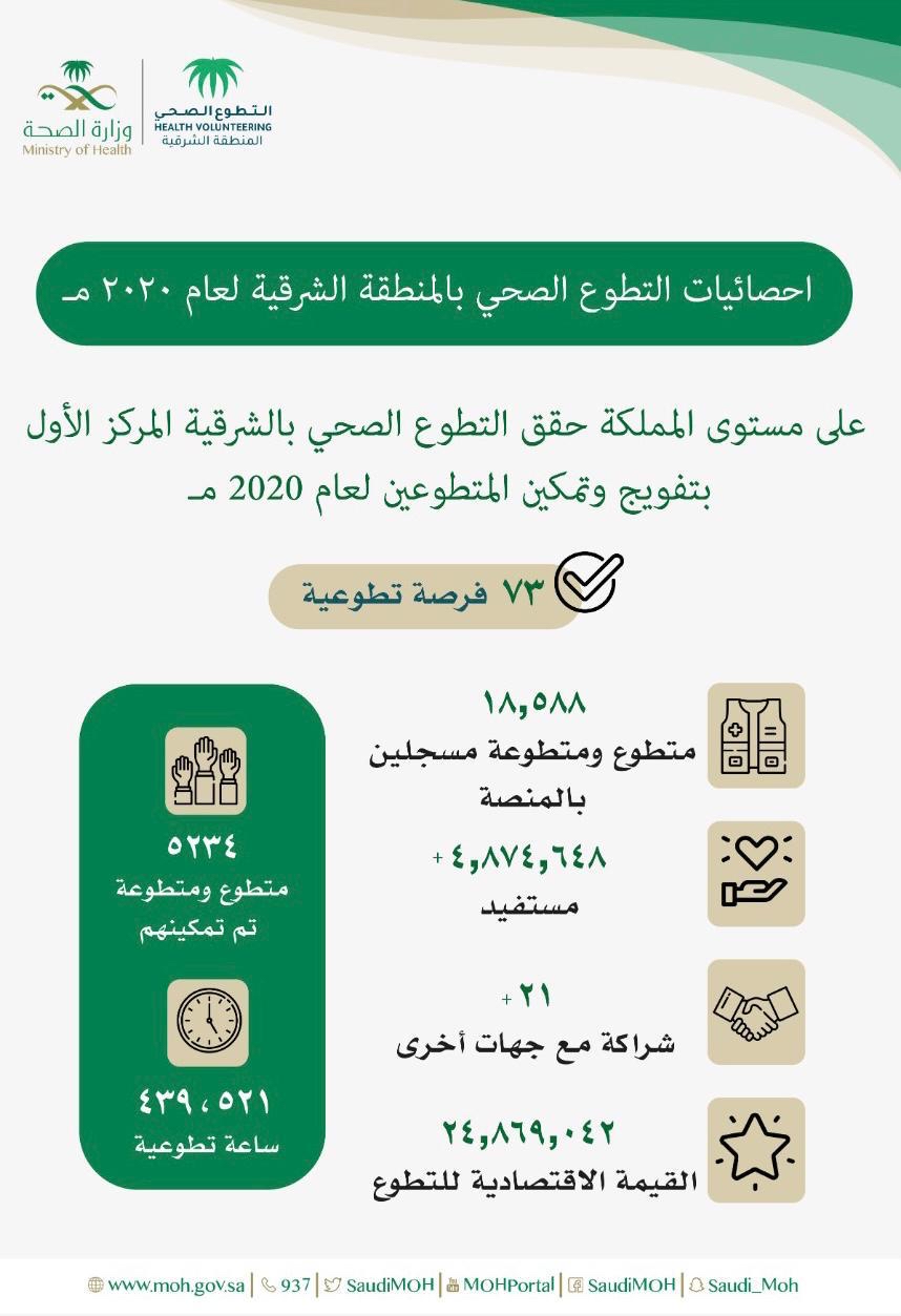 حقق التطوع الصحي بالمنطقة الشرقية المركز الأول على مستوى المملكة في عام 2020.
