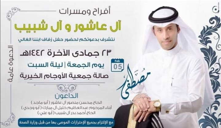 تحتفل عائلة آل عاشور وآل شبيب في الأوجام مساء يوم الخميس بزفاف الشاب مصطفى محسن منصور آل عاشور على كريمة الحاج أحمد بدر آل شبيب «أبو علي» في استراحة محسن منصور آل عاشور من الساعة 7:30 الى 9:30 ليلا وسط فرحة الأهل والأصدقاء ومحبي العريسين.