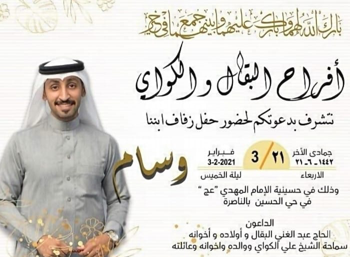 تحتفل عائلة البقال والكواي في القطيف مساء يوم الأربعاء بزفاف الشاب وسام عبد الغني البقال على كريمة الشيخ علي الكواي في حسينية الإمام المهدي بحي الحسين بالناصرة وسط فرحة الأهل والأصدقاء ومحبي العريسين.