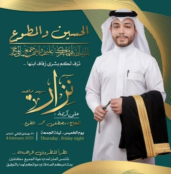 احتفلت عائلة الحسين والمطوع في سيهات مساء يوم الخميس بزفاف الشاب السيد نزار السيد ماجد الحسين على كريمة الحاج مصطفى محمد المطوع وسط فرحة الأهل والأصدقاء ومحبي العريسين.