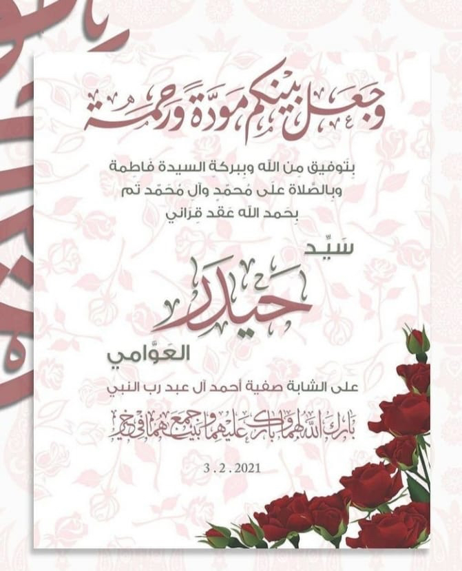 احتفلت عائلة العوامي وآل عبد النبي في القطيف مساء يوم الأربعاء بعقد قران الشاب السيد حيدر العوامي على الشابة صفية أحمد آل عبد النبي وسط فرحة الأهل والأصدقاء ومحبي العريسين.