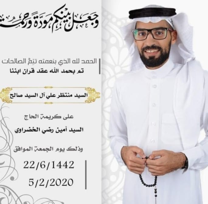 احتفلت عائلة آل السيد صالح والخضراوي في القطيف مساء يوم الجمعة بعقد قران الشاب السيد منتظر علي آل السيد صالح على كريمة الحاج السيد أمين رضي الخضراوي وسط فرحة الأهل والأصدقاء ومحبي العريسين.