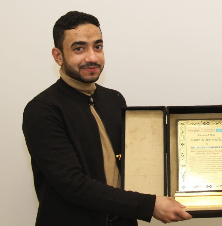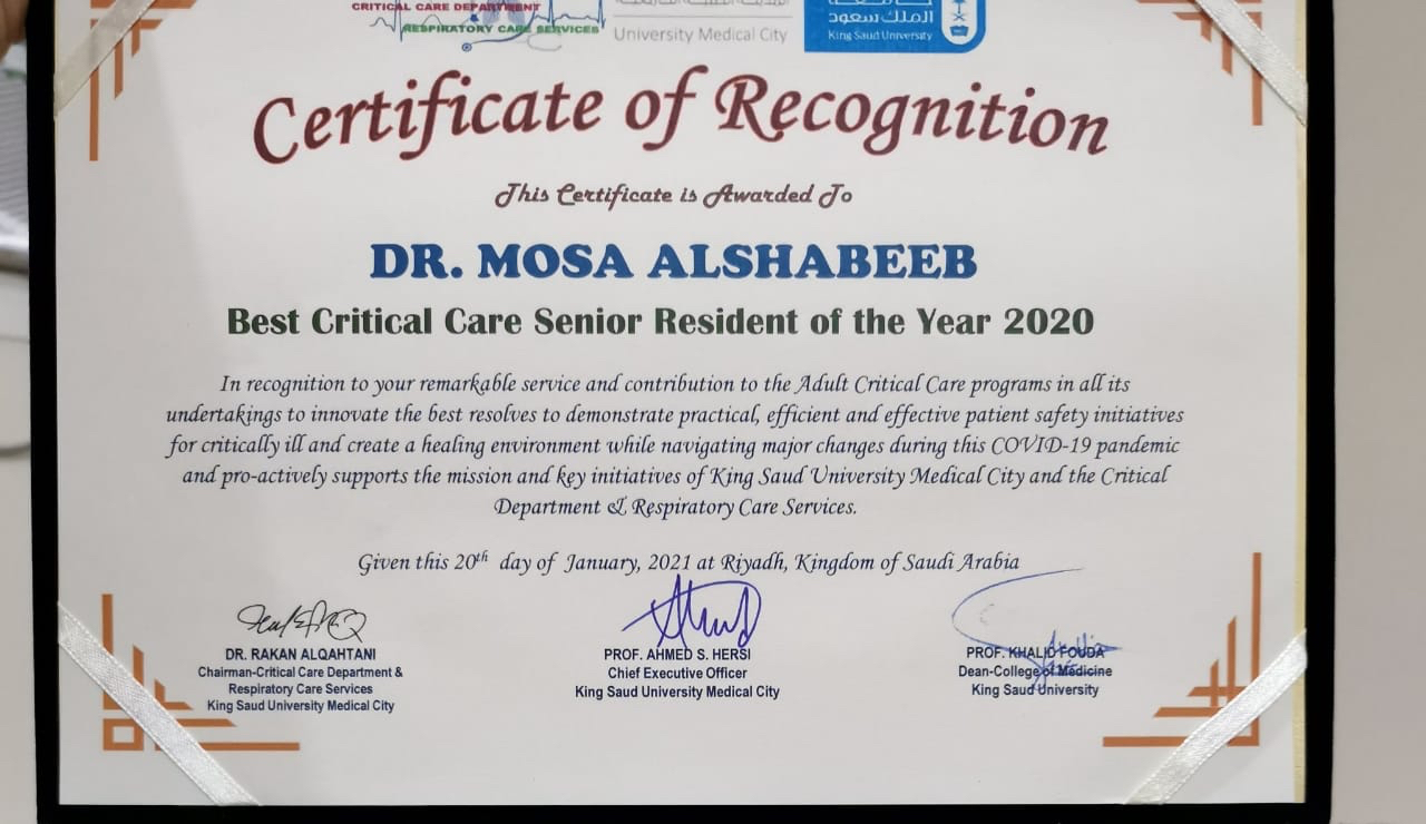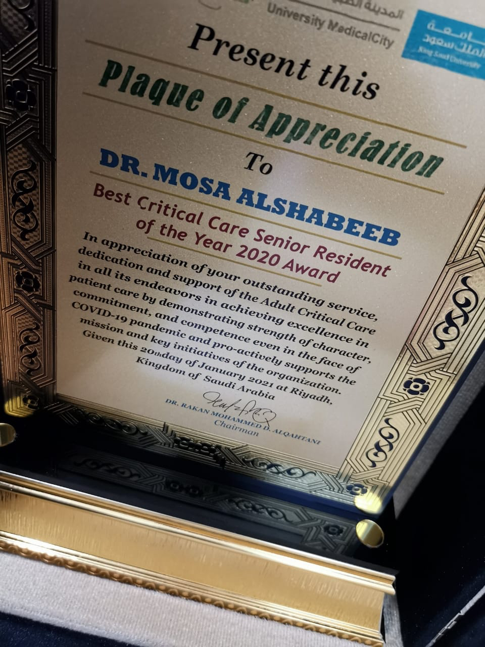 برعاية قسم العناية المركزة بجامعة الملك سعود بالرياض أقامت الجامعة حفل تكريم للدكتور موسى الشبيب كأفضل طبيب مقيم مختص عناية مركزة لعام 2020 لما قدمه من جهد وتفاني خلال جائحة كورونا.