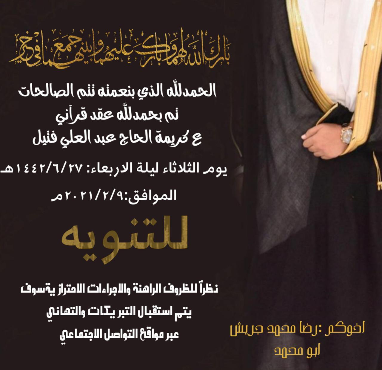 احتفلت عائلة جريش وفتيل في القطيف مساء يوم الثلاثاء بعقد قران الشاب رضا محمد جريش على كريمة الحاج عبد العلي فتيل وسط فرحة الأهل والأصدقاء ومحبي العريسين، الذين قدموا لهما التهاني والتبريكات.
