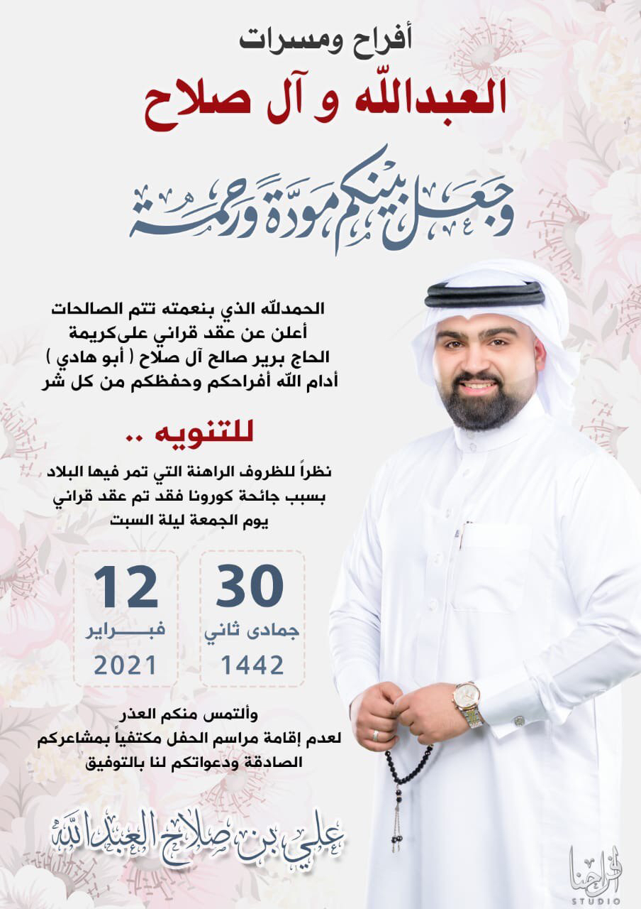 احتفلت عائلة العبدالله وآل صلاح في صفوى مساء يوم الجمعة بعقد قران الشاب علي صلاح العبدالله على كريمة الحاج برير صالح آل صلاح «أبو هادي» وسط فرحة الأهل والأصدقاء ومحبي العريسين.