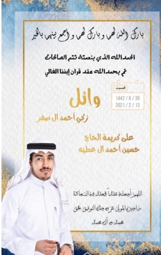 احتفلت عائلة آل صفر وآل عطية في العوامية مساء يوم السبت بعقد قران الشاب وائل زكي أحمد آل صفر على كريمة الحاج حسين أحمد آل عطية وسط فرحة الأهل والأصدقاء ومحبي العريسين.