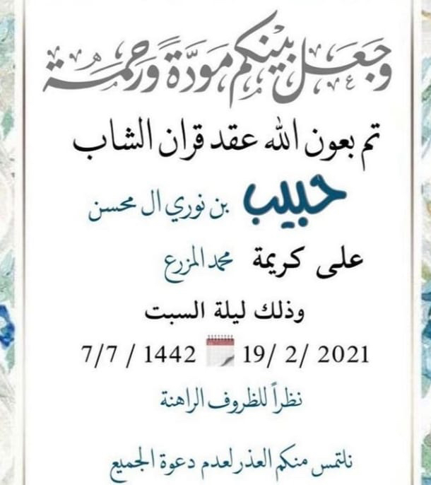 احتفلت عائلة آل محسن والمزرع في تاروت مساء يوم الجمعة بعقد قران الشاب حبيب نوري آل محسن على كريمة الحاج محمد المزرع وسط فرحة الأهل والأصدقاء ومحبي العريسين، الذين قدموا لهما التهاني والتبريكات.