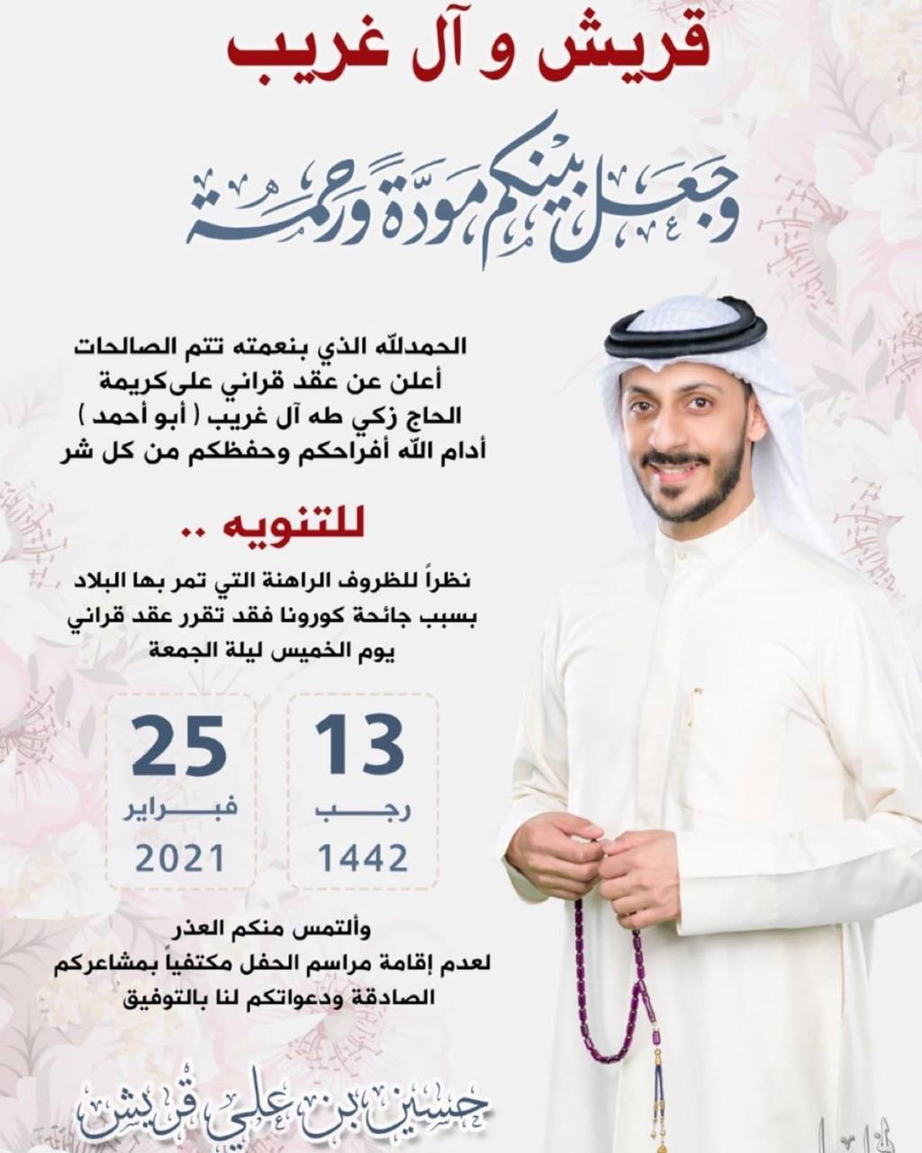 تحتفل عائلة قريش وآل غريب في صفوى مساء يوم الخميس بعقد قران الشاب حسين علي قريش على كريمة الحاج زكي طه آل غريب «أبو أحمد» وسط فرحة الأهل والأصدقاء ومحبي العريسين.