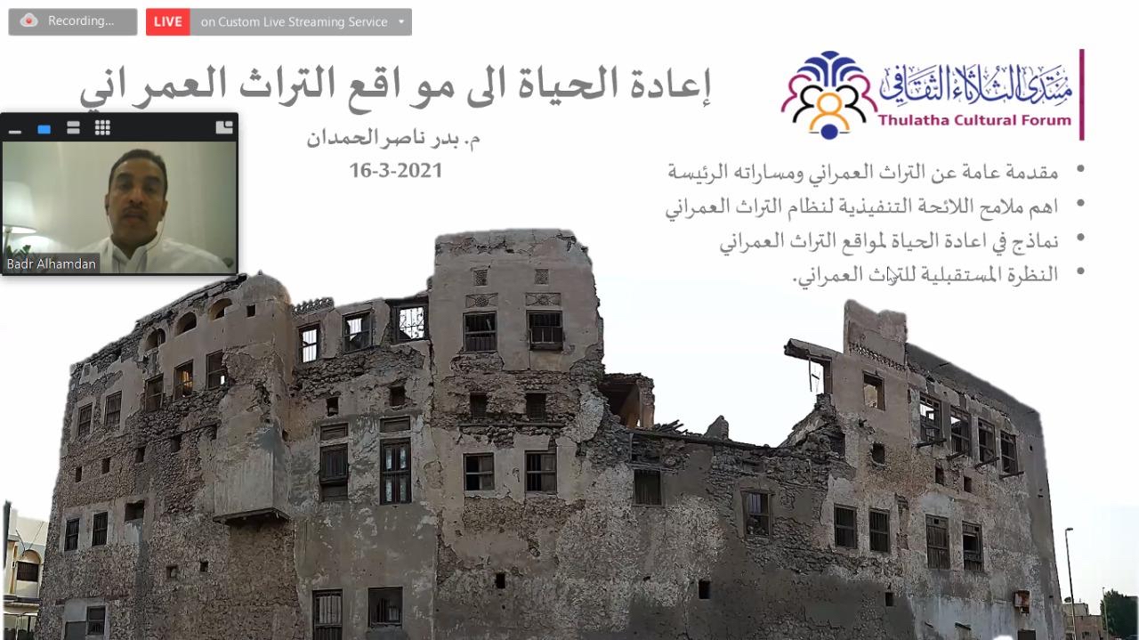 وتحدث الحمدان في ندوة حوارية تحت عنوان ”عودة الحياة لمواقع التراث العمراني“، نظمها منتدى الثلاثاء الثقافي مساء الثلاثاء، عن مختلف أبعاد عودة الحياة لمواقع التراث العمراني والتحديات التي تواجهه، وأدار اللقاء المعماري سامي الحداد بحضور عديد من الخبراء والأكاديميين المختصين.