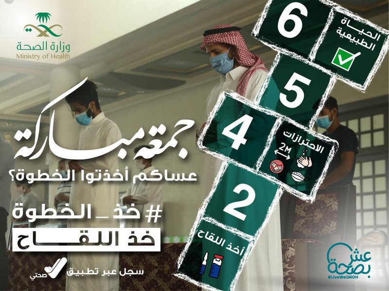 وفعّلت الصحة أنشطة الحملة، حيث وجهت اليوم ”الجمعة“ رسالة تذكيرية للجميع تضمنت ”عساكم أخذتوا الخطوة“ وتهدف من خلالها إلى إعادة التأكيد على ضرورة أخذ الخطوة والمبادرة بالتسجيل عبر تطبيق صحتي للحصول على لقاح كورونا من خلال مراكز اللقاح المنتشرة في مناطق المملكة كافة.